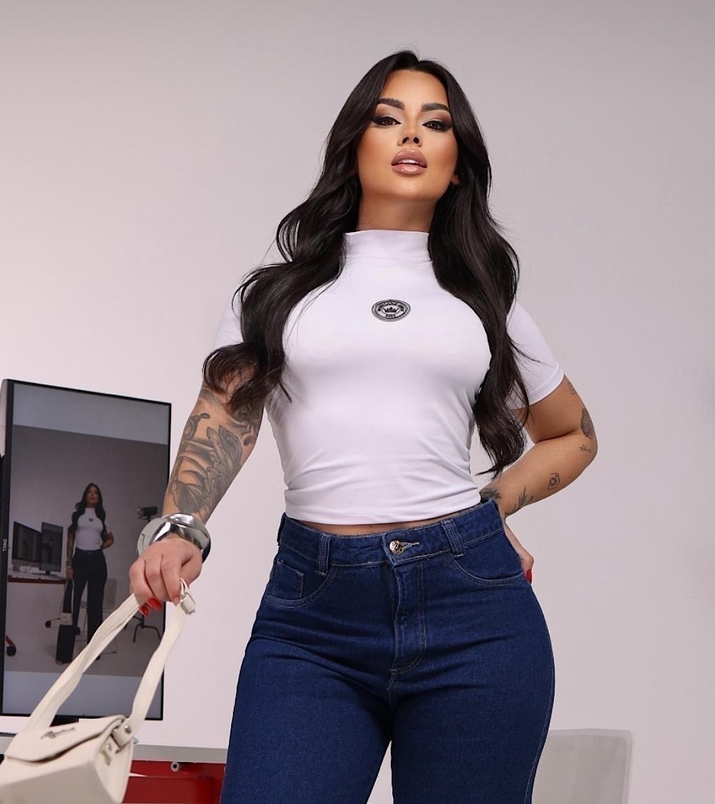 Camiseta feminina estilo cropped, confeccionada em malha de algodão com toque macio. Possui gola meia-alta (mais estruturada, sem ser justa como gola alta), mangas curtas e caimento ajustado ao corpo. O destaque fica por conta do logo da marca estampado na parte frontal, trazendo identidade e estilo ao look. Ideal para compor visuais urbanos e despojados.